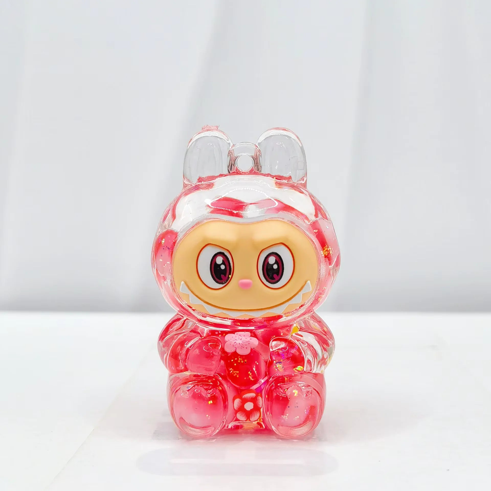 Este adorable llavero transparente mide 5 x 3 x 3 cm y está lleno de detalles encantadores. En su interior, un líquido tipo aceite hace flotar bolitas de colores, mostacillas, estrellitas y otros brillos, creando un efecto sensorial relajante con cada movimiento.